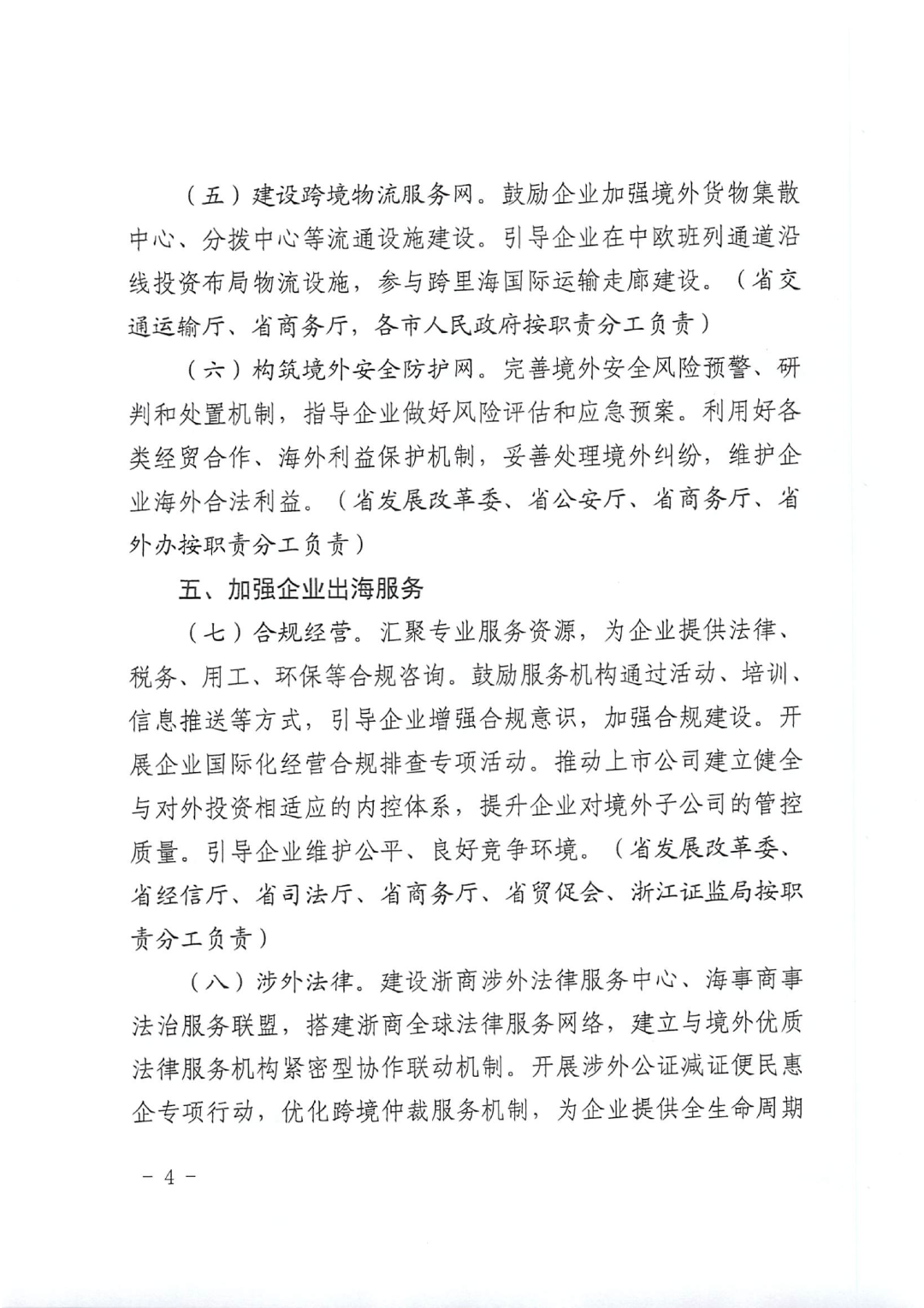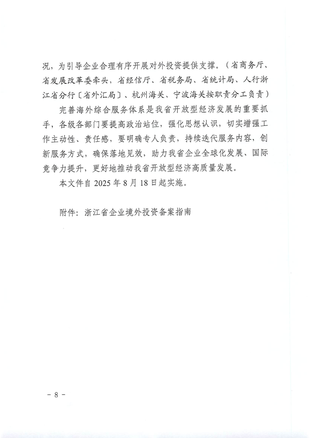 《若干举措》系浙江省深入贯彻党中央、国务院关于推动高水平对外开放、支持企业“走出去”参与国际竞争与合作的重要部署,按照“一个平台、一窗受理、建强网络、加强服务、强化监测”的总体思路,聚焦企业出海全链条各环节的痛点难点,着力构建覆盖事前、事中、事后的系统性服务体系,以“服务最优、成本最低、效率最高”为原则,推进浙江省企业对外投资和海外经营提质升级。